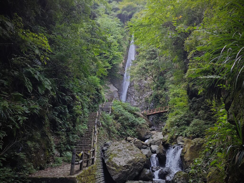 正面に見えるのが洒水の滝で以前は階段を通して滝近くまで行けたようです。しかし落石があり安全を配慮して別ルートが開設されました。