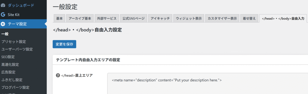 メタ ディスクリプションを追加する方法としては、テーマ設定-一般設定で下記の箇所に入力し変更を保存のボタンを押します。