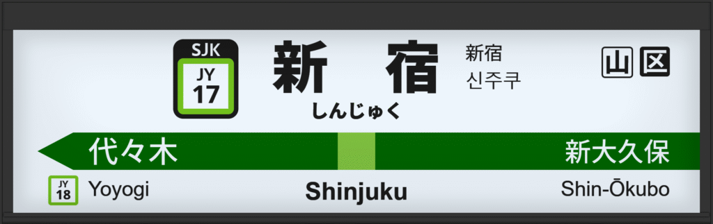 新宿駅南口から歩いて5分程度で代々木駅に到着します。南口の前の大通りは甲州街道ですが、ここを真っすぐ右に進みますが最初の交差点を左に進むと代々木駅です。