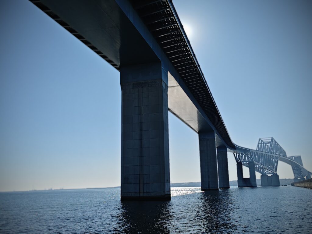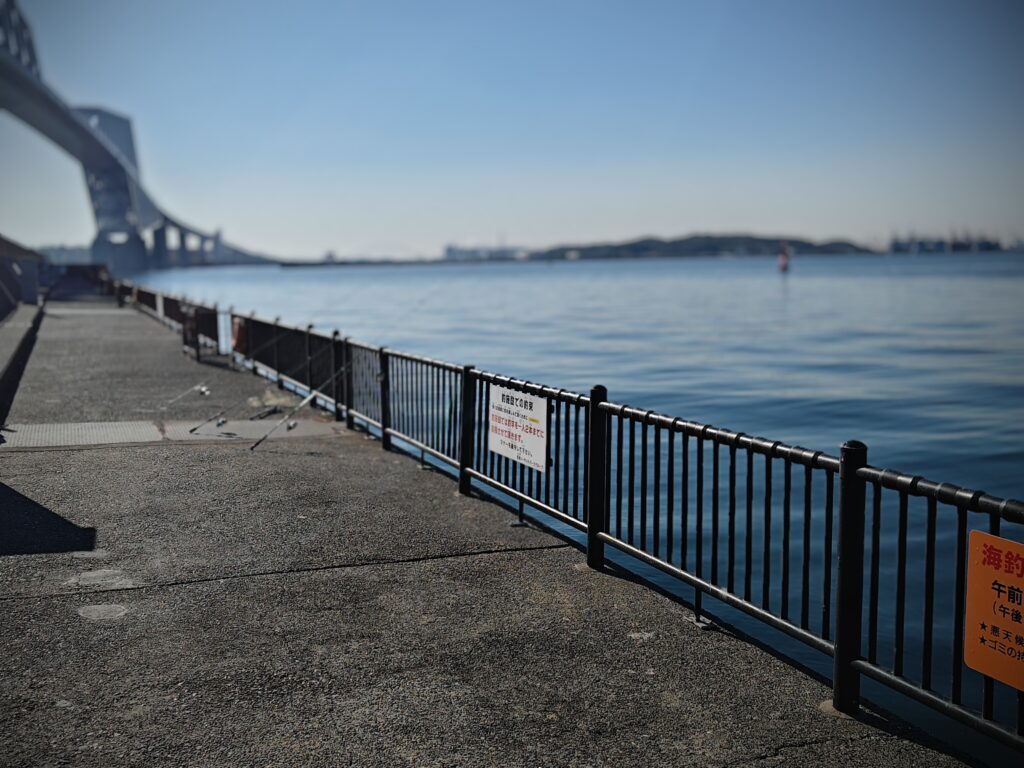 橋の下から撮影しました。若洲海浜公園には正式に釣り場があり奥まで歩いて行けるので、丁度橋の中央部付近まで行けます。釣り人の邪魔にならないように行ってみることにしました。