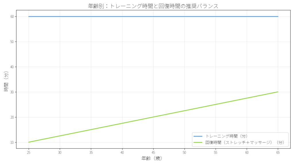 研究では、年齢とともに筋肉の弾力性が低下し、回復に必要な時間が増えることが示されています。そのため、以下のような比率が合理的です。